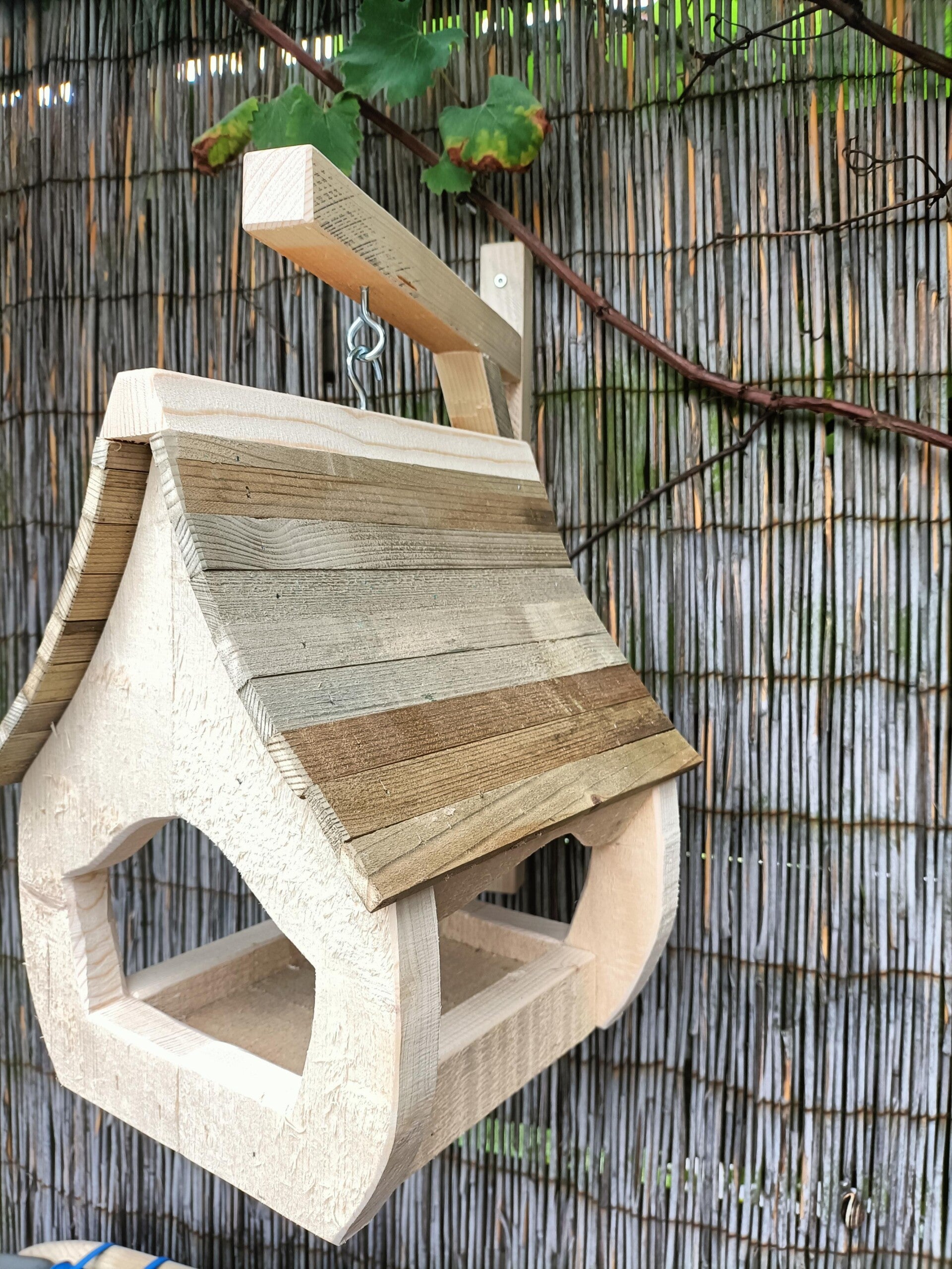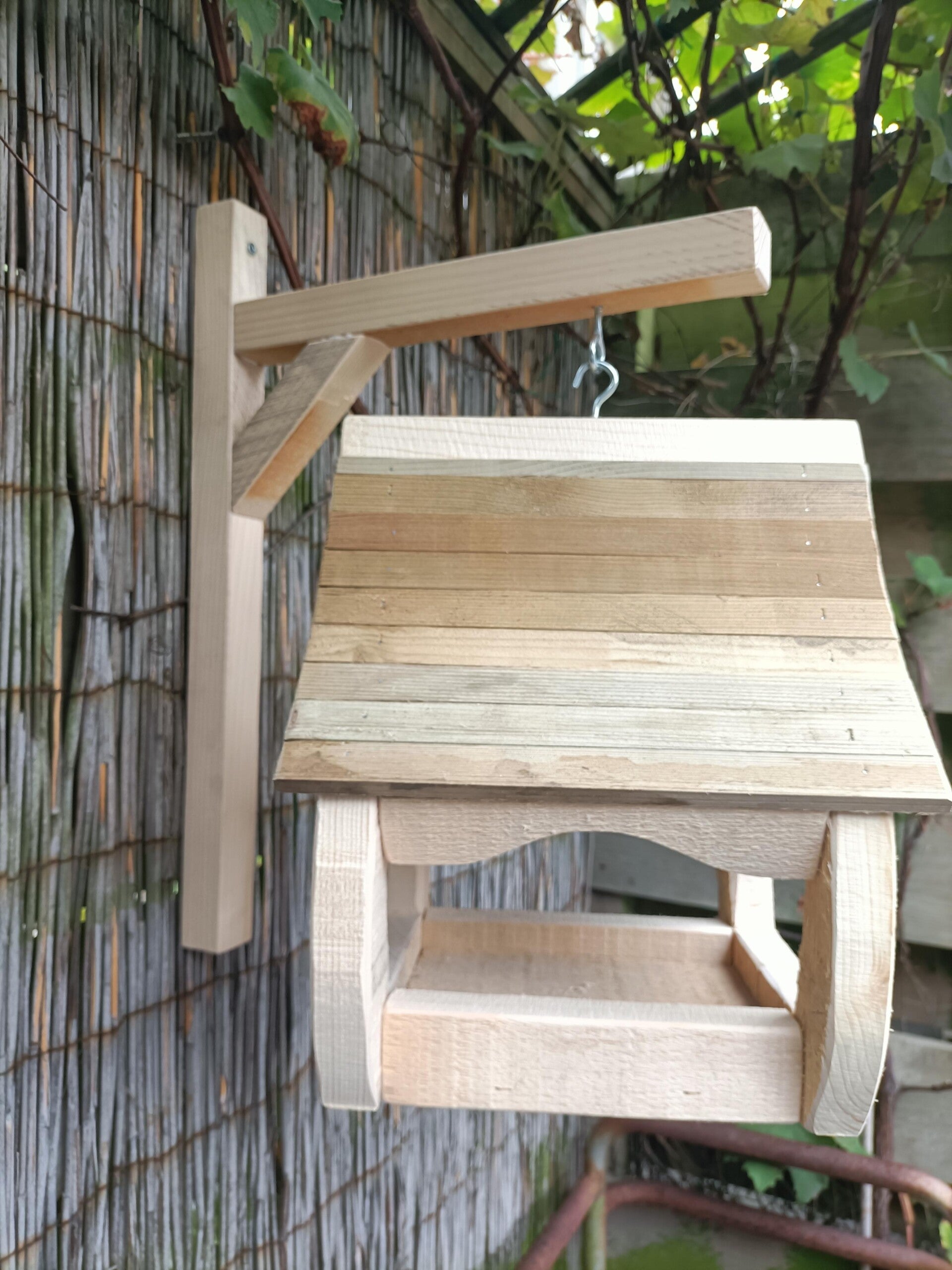 Deze mooie voerhanger compleet met ophangsteun is helemaal gemaakt van afvalhout, mooi voorbeeld van hergebruik van materiaal dus. De voerhanger is 30 cm hoog en 25cm lang.