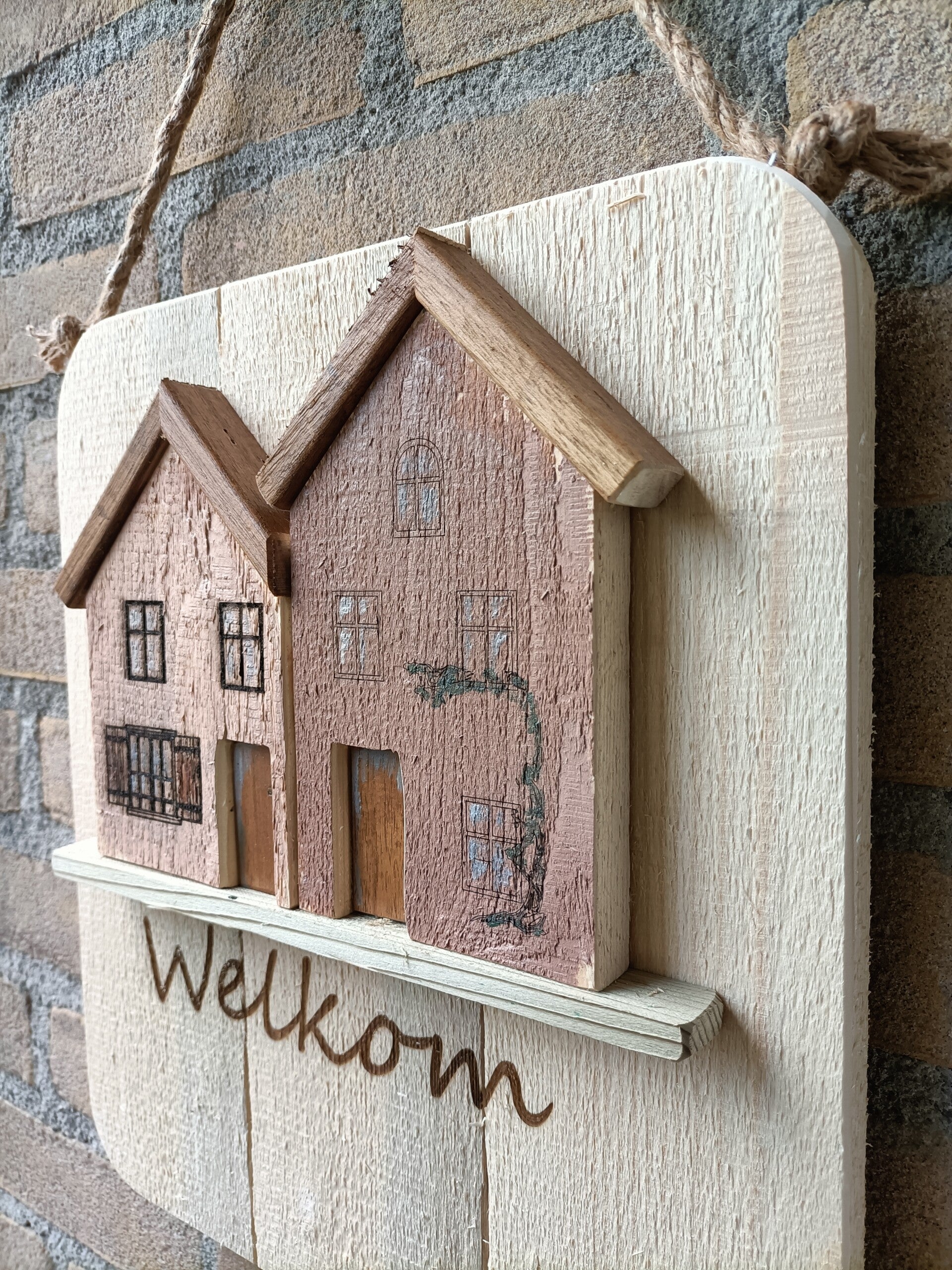 Leuke bord voor bij de voordeur, onder "welkom" kan uw eigen tekst/naam. Het bord is van vurenhout en circa 34 bij 29 cm groot.